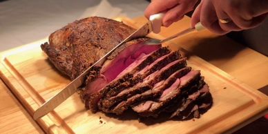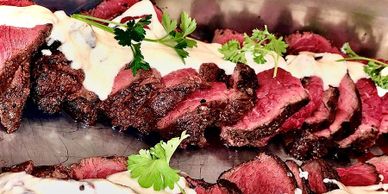 Grilled Ribeye Steaks. Sliced and serves as strips unless requested otherwise. Prices may vary depending on market pricing.