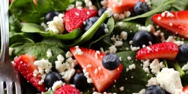 Our very own Blueberry and Strawberry, Summer Salad tossed over Spinach, Feta and our House Blueberry Vinaigrette.