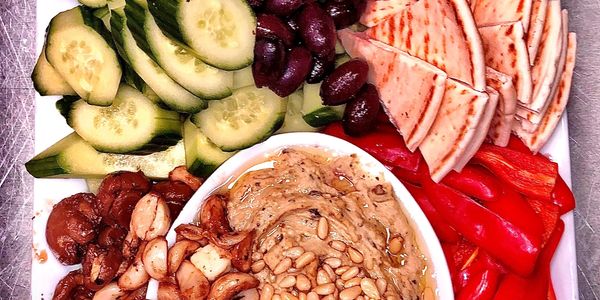 Our Hummus Trays come with an assortment of market fresh veggies, olives, pita bread and hummus.