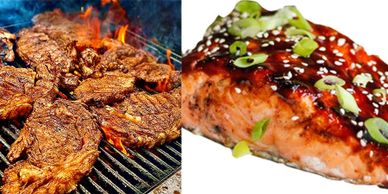 Ribeye Steak Strips and Asian Sticky BBQ Salmon
